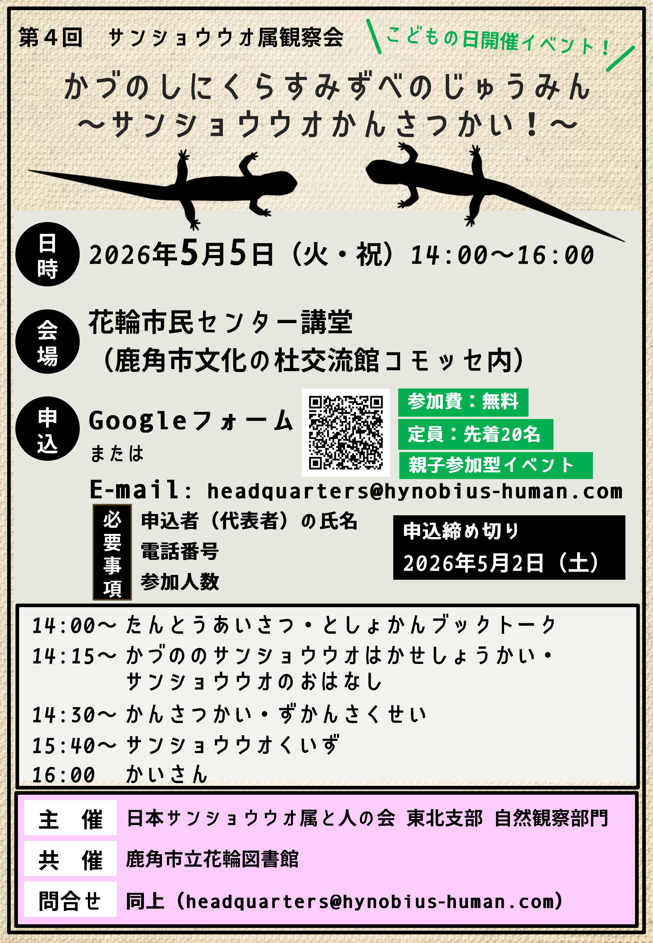 「第4回 サンショウウオ属観察会 かづのしにくらすみずべのじゅうみん ~サンショウウオかんさつかい!~」